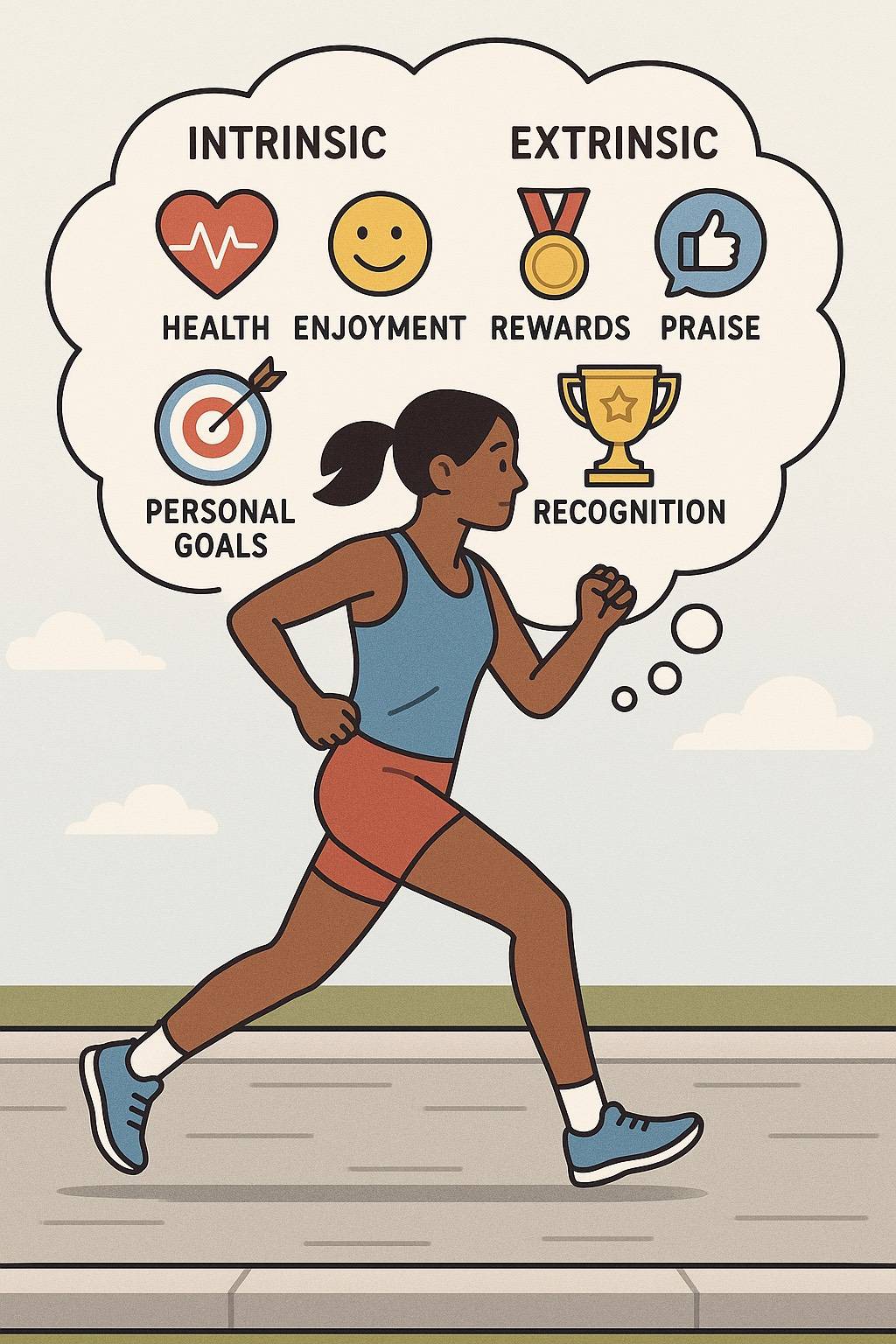 Many runners begin with motivations that appear extrinsic, such as running to spend time with friends, joining a running group, or collecting race medals. Over time, as they build skill and confidence, their motivation often becomes more internalized, shifting toward personal growth, enjoyment, and a deeper sense of purpose.